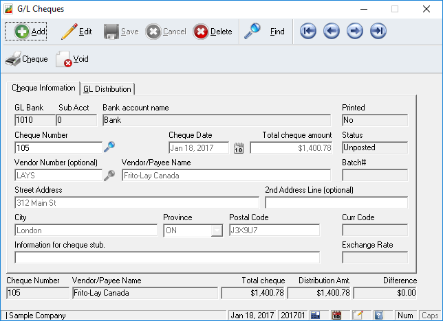 Cheques can be printed directly from the General Ledger, which is handy for non-payable items like GST and Source Deductions.