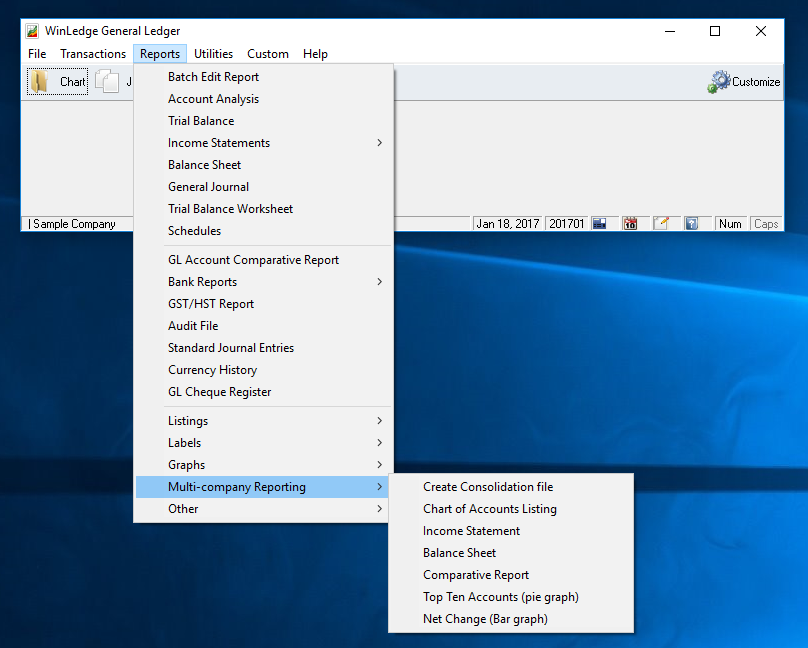 Winledge GL includes the ability to define cost centers or departments within the company. By using them not only can you roll up GL numbers but you can also produce income statements by division as well. For example perhaps your company has its head office in Toronto, but you also process the books for the Calgary location. Now in the one set of books you can keep both sets of numbers and simply run separate income statements by division.