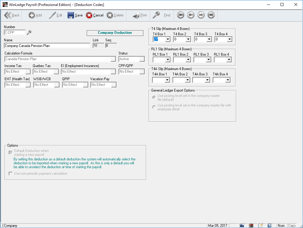 Set up as many deductions as you need.  Define the way each deduction behaves, the effect on taxes and CPP, Vacation Pay, EI, WSIB, EHT etc. etc.   Set maximums and minimums per pay, per period or lifetime.   Set T4 boxes to allocate to.